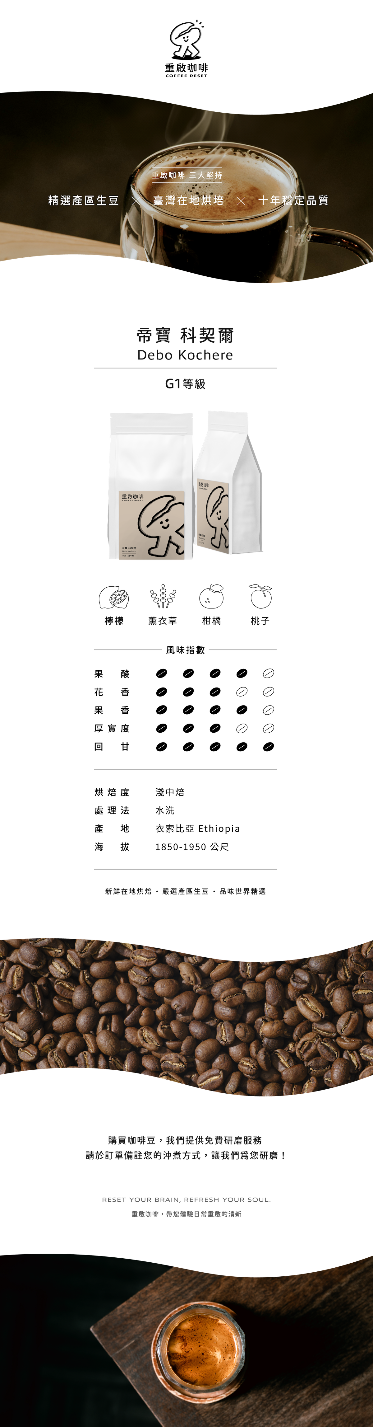 ⚆ 檸檬,薰衣草,柑橘,桃子◆烘焙度:淺中焙◆處理法:水洗◆產地:衣索比亞 Ethiopia◆海拔:1850~1950公尺